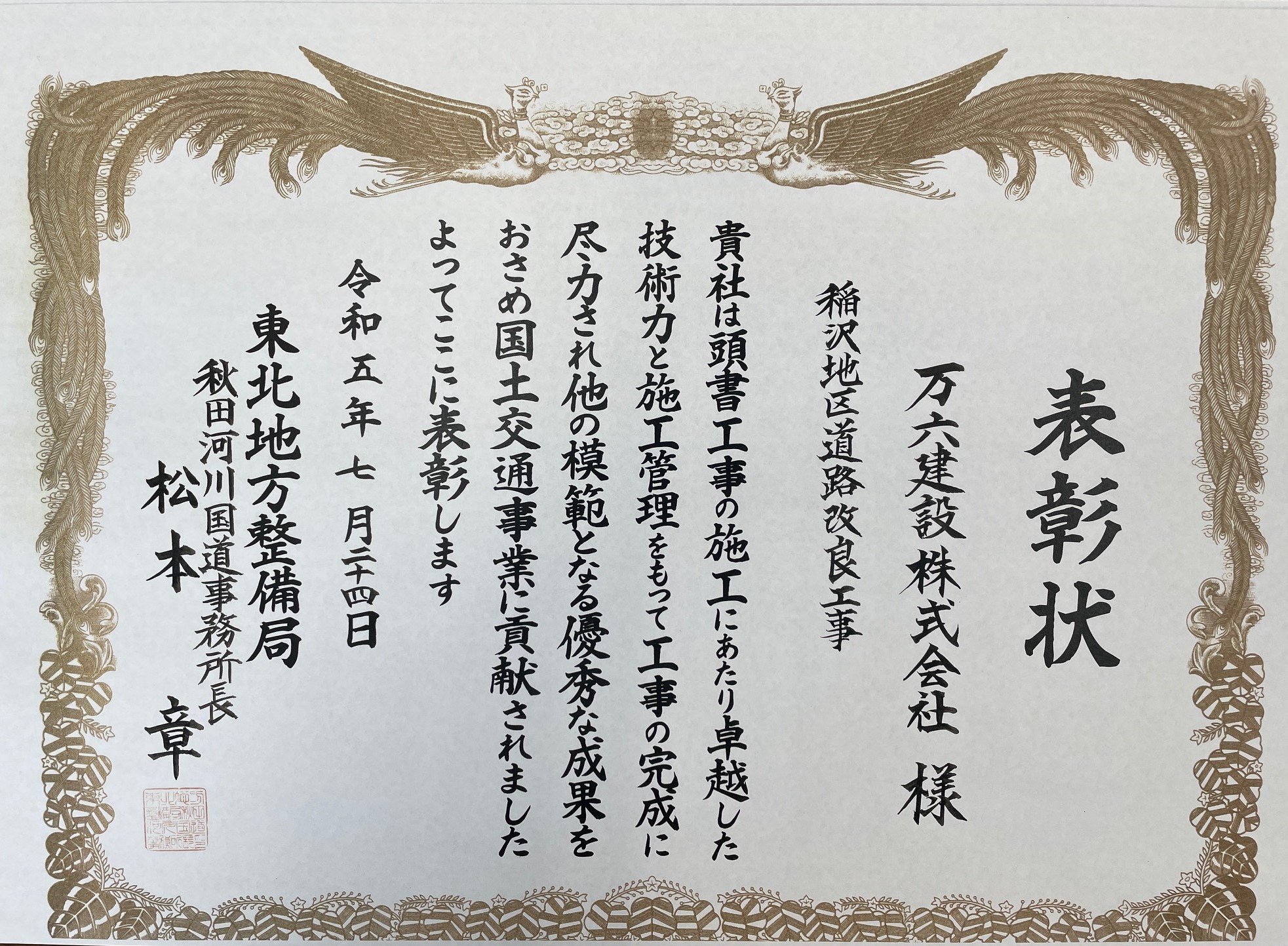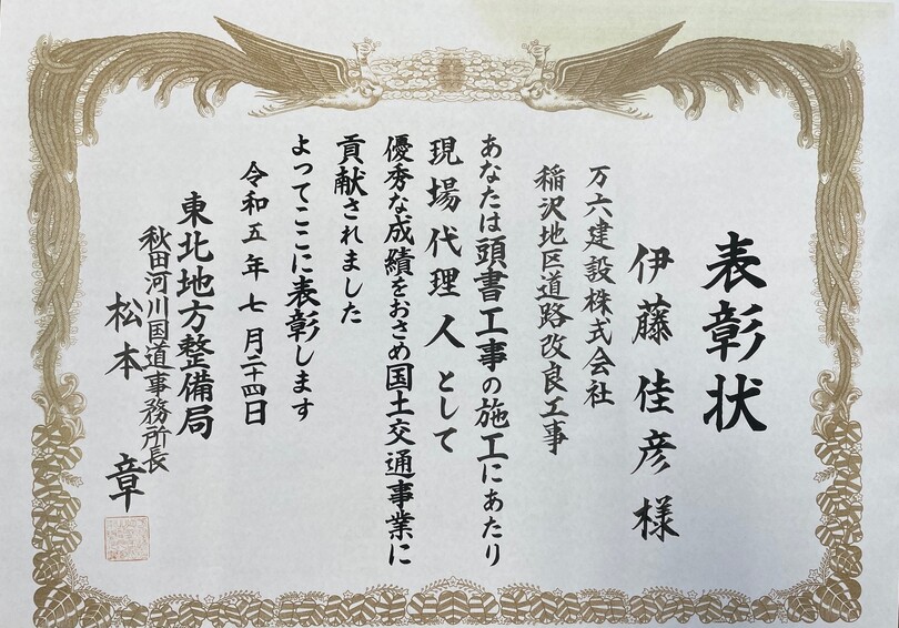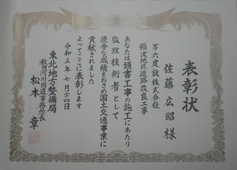 秋田河川国道事務所長表彰表彰 2025.10.01 2023.08.308月29日(火)秋田河川国道事務所長表彰式にて、稲沢地区道路改良工事が「優良工事」「優良技術者」を受賞しました。(記録的大雨のため7月24日より延期) ・優良工事 万六建設株式会社・優良技術者 稲沢地区道路改良工事 現場代理人 伊藤 佳彦 監理技術者 佐藤 広昭
