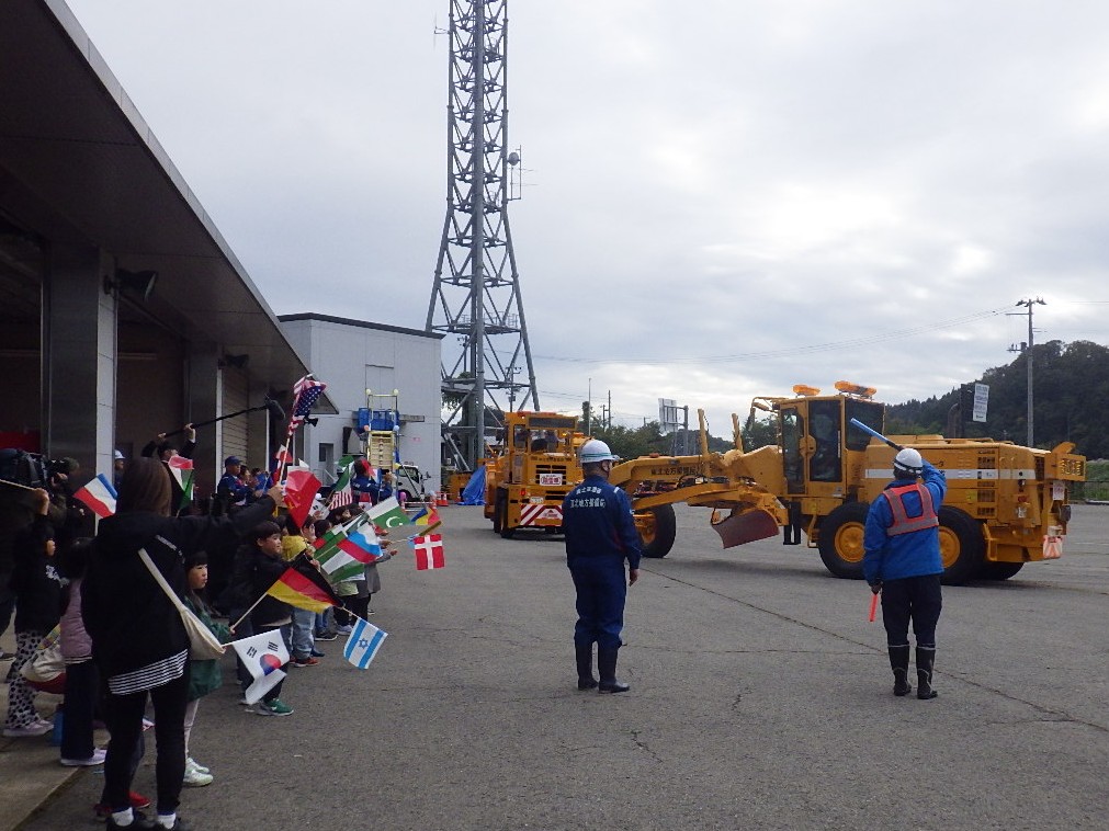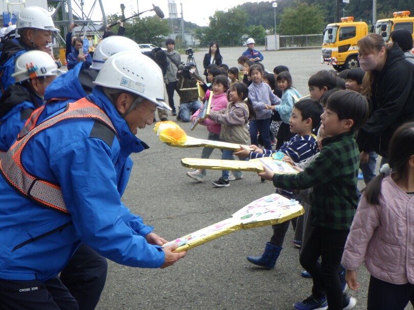 式では園児から作業員たちへ大きな鍵のレプリカが手渡され、受け取った作業員たちが乗り込んだ除雪車両は、園児らが元気いっぱいに旗を振って見送る中、次々に出発していきました。