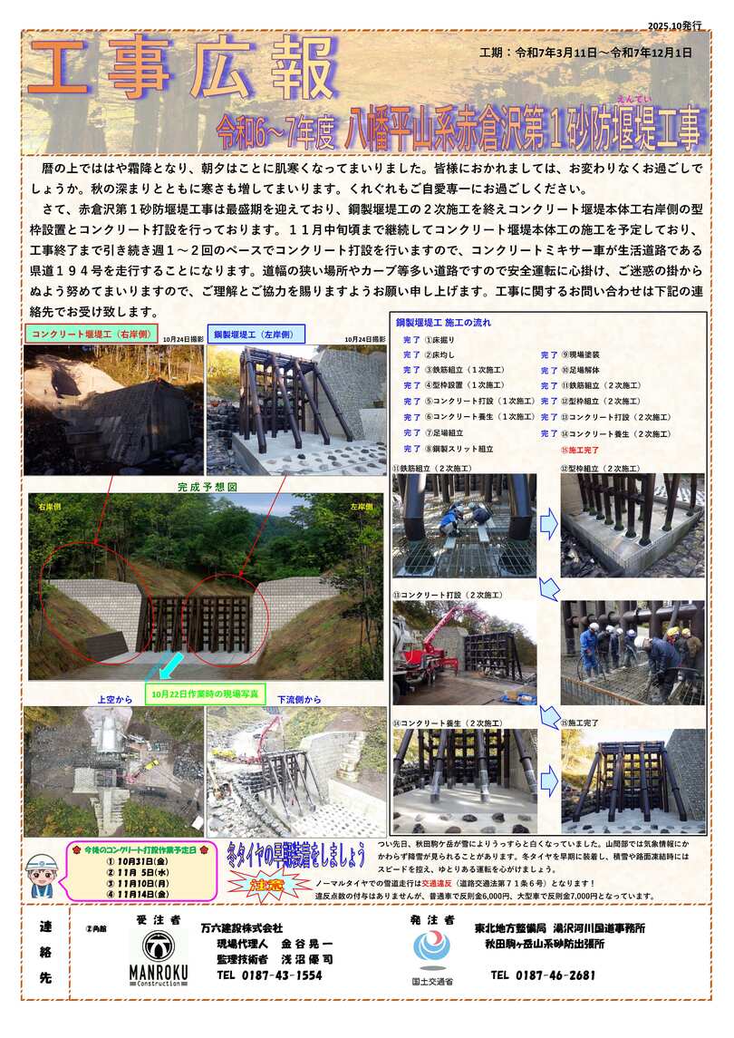 10月の八幡平山系赤倉沢第1砂防堰堤工事広報が発行されました。